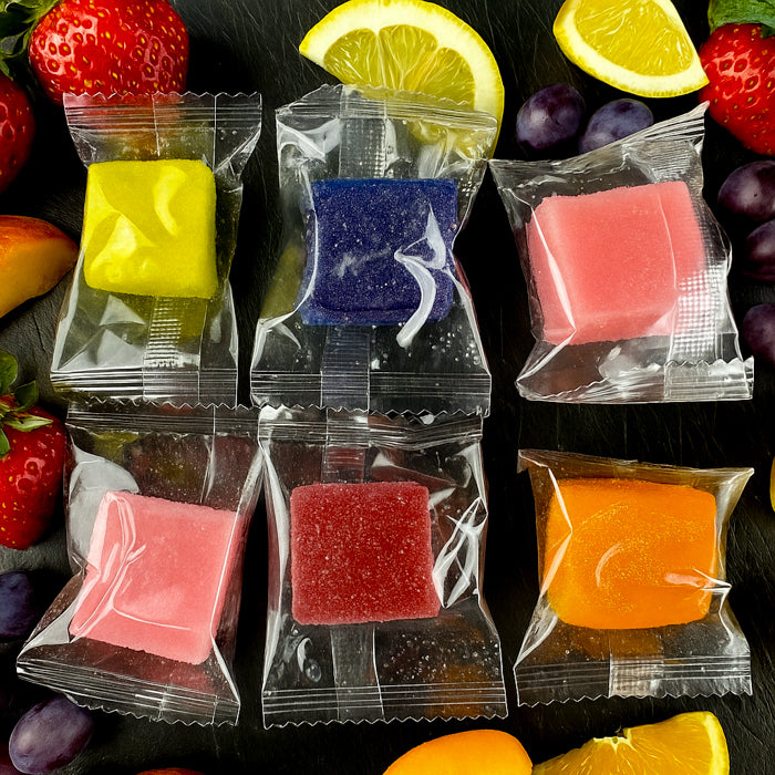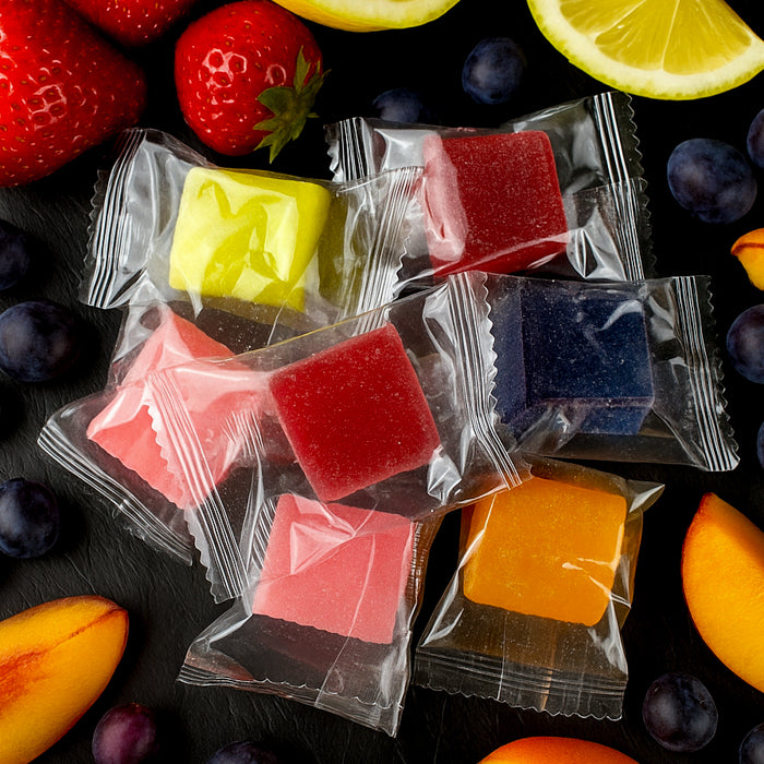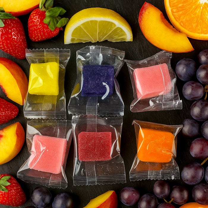 Košļājamās konfektes MIX - mango, zemenes, vīnogas, ķirši, ananāsi, citroni, apelsīni, persiki, avenes un mellenes. Mēs pievienojam miksā tās garšas, kuras ir pieejamas uz pasūtījuma brīdi, tāpēc garšas mēdz būt arī mazāk nekā desmit, jo ir uzskaitītas visas iespējamās.