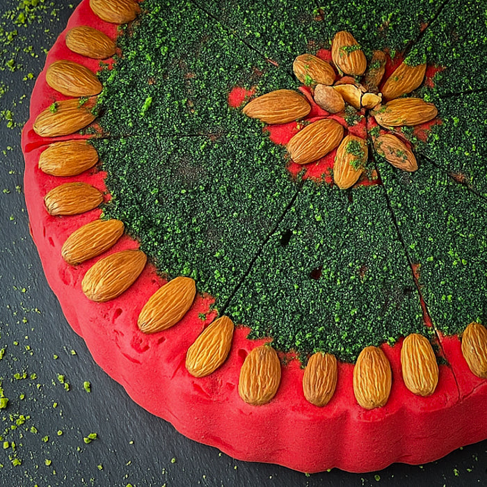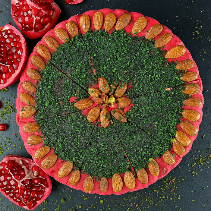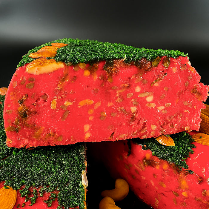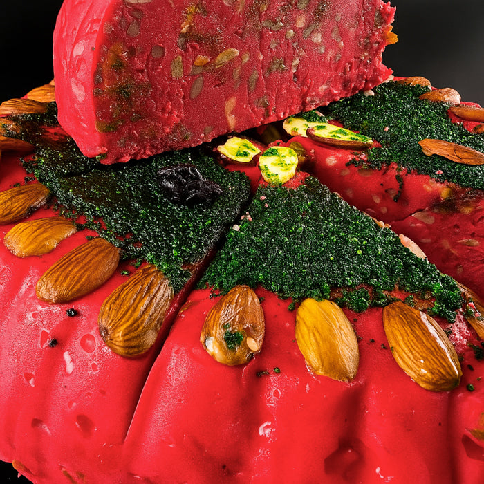 Supergarda kūka no Samarkandas halvas ar sulīgu granātābolu garšu un pildīta ar žāvētiem augļiem, riekstiem un saulespuķu sēklām! Garša ir vidēji saldena, jūtams neliels granātābola skābums un viegla riekstu garša.