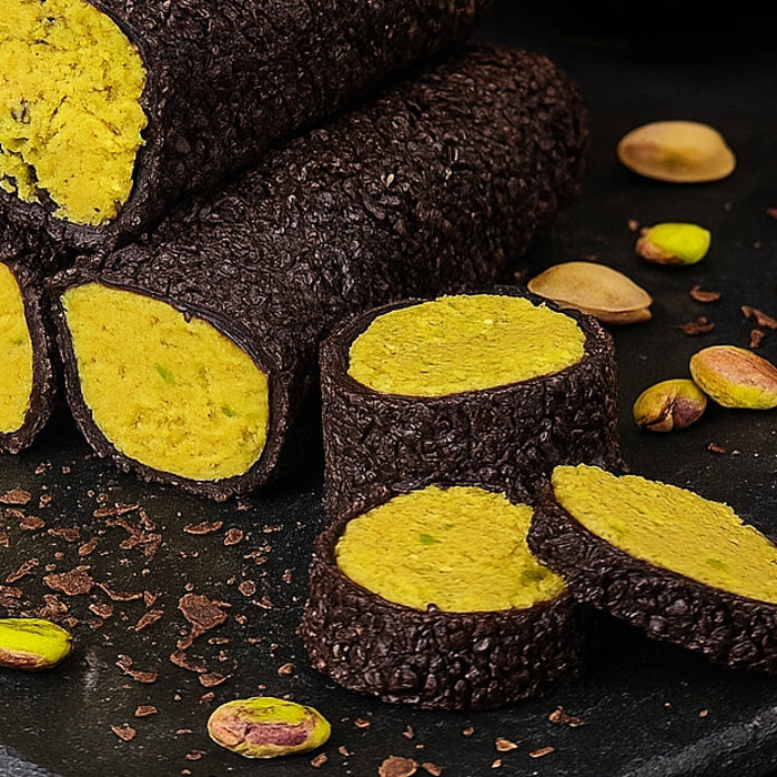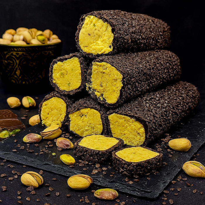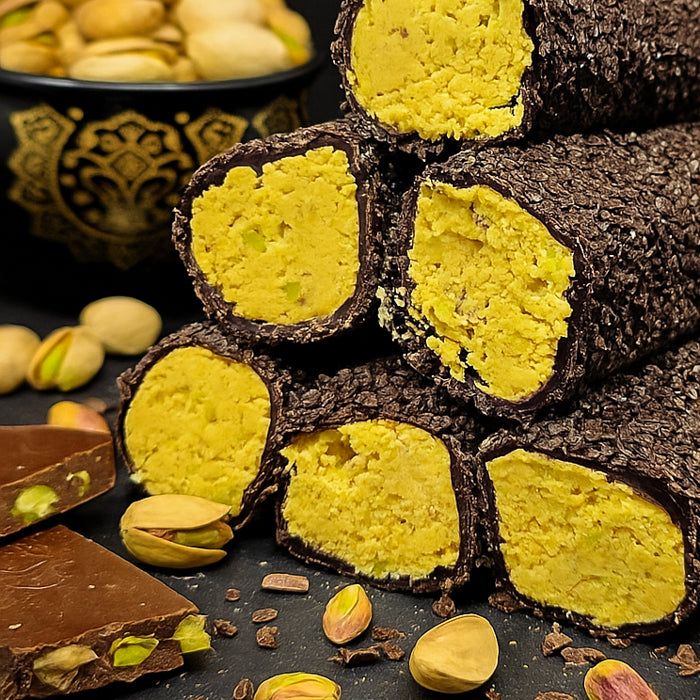 Atraskite rafinuotą rytietišką desertą su šiuolaikiniu prisilietimu – Dubajaus lukumą! Šis skanėstas sujungia prabangų šokoladinį kremą su riešutų aromatu, siūlydamas nepamirštamą skonio patirtį kiekviename kąsnyje. Lukumos įdare yra švelnus pistacijų kremas, kuris puikiai dera su turtingu šokolado atspalviu ir suteikia desertui būdingą rytietišką žavesį.