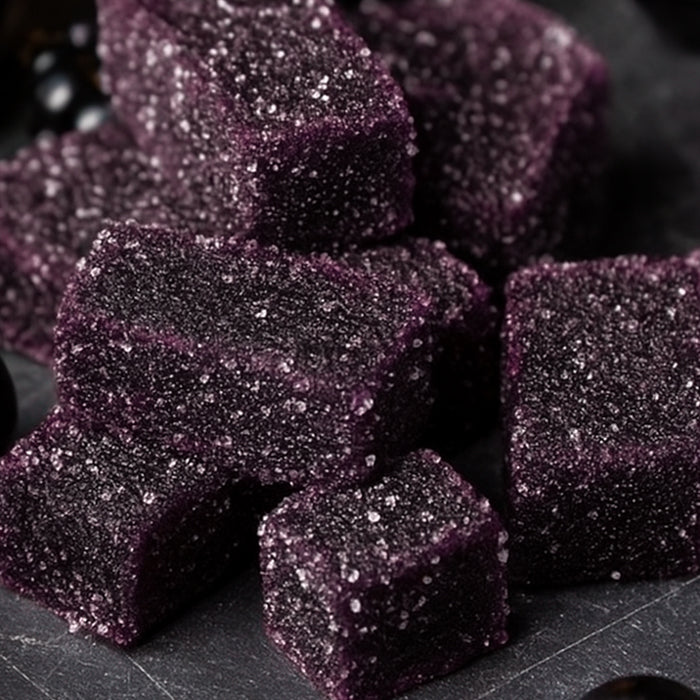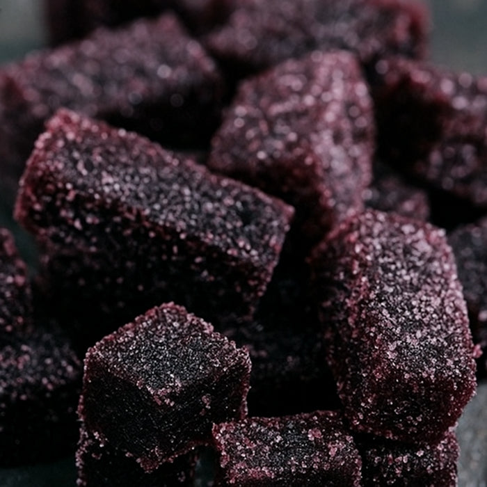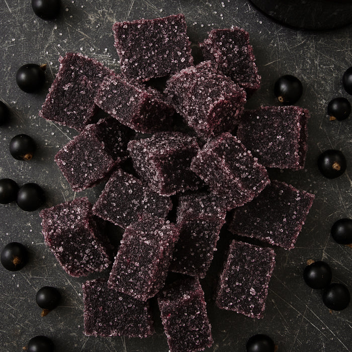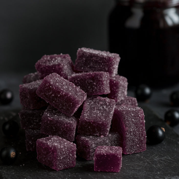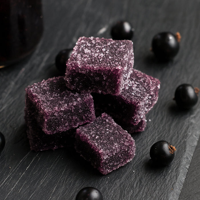 Švelnios tekstūros marmeladas su ryškiu juodųjų serbentų skoniu. Pagamintas iš natūralių žaliavų, turintis daug antioksidantų ir vitamino C. Puikiai tinka kaip saldus užkandis arba sveikas energijos šaltinis dienos metu. Kiekvienas gabalėlis padengtas cukraus sluoksniu, suteikiančiu malonų traškumą.