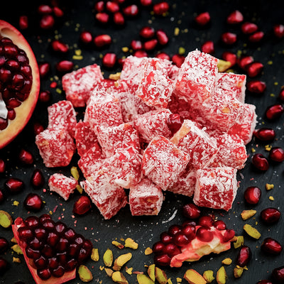Granatų lukumas su pistacijomis ir kokoso drožlėmis